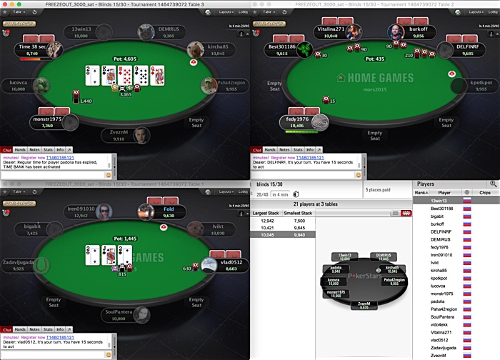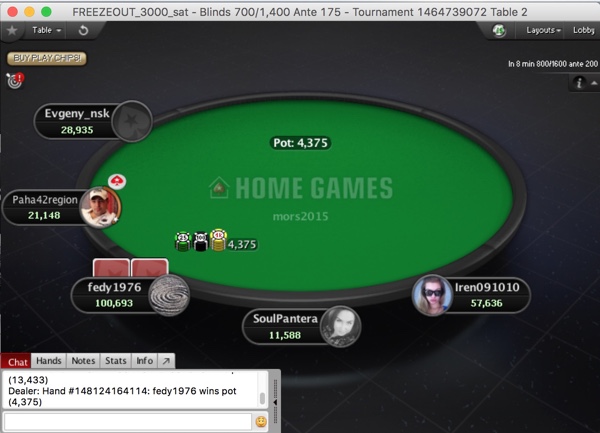 Как обычно в 19:00 начался очередной финальный сателлит на APT Main Event в несравненном "mors2015". Перед стартом случился небольшой творческий спор о размере бай-ина во фризаут. Неделю назад мы еле-еле наскребли 11 входов по 3,000. А вот в пятницу на 5-тысячник собралось 16 игроков, а могло бы и больше... От этого и собирались плясать, назначив бай-ин в 5,000. Но выяснилось, что за две недели мы так привязали всех к цифре "3", что о другом бай-ине никто и слушать не хотел, даже несмотря на то, что количество билетов в мэйн при этом увеличилось бы на треть. В общем, возникло альтернативное предложение прям по Карцеву: пускай сегодня раки сателлит будет маленьким, по три рубля, но зато завтра - уже по пять, ну о-о-очень большим! Кажется, это предложение всех примирило.