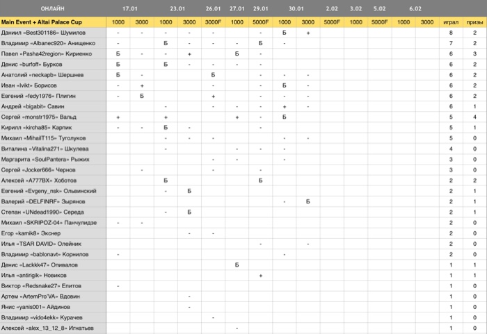 Main Event(15): Евгений Плигин, Анатолий Шершнев (2), Егор Экснер, Валерий Зырянов (все - Барнаул), Евгений Ольвинский, Алексей Хоботов, Андрей Шахтарин, Степан Середа (все - Новосибирск), Владимир Анищенко (Бийск), Павел Кириенко (Новокузнецк), Иван Белухи (Ярославль), Александр Бирюков (Тамбов), Михаил Кеплеров, Максим Аршиненков (оба - Тверская обл.); Altai Palace Cup: (18) Алексей Хоботов, Кирилл Карпик, Денис Опивалов (все - Новосибирск), Денис Бурков (2), Анатолий Шершнев, Владимир Курачев, Сергей Ворона, Евгений Максимов, Денис Захаров, Иван Борисов, Артëм Кулибаба (все - Барнаул), Павел Кириенко (2; Новокузнецк), Сергей Вальд, Владимир Анищенко (оба - Бийск), Даниил Шумилов (Абакан), Амаду Кользенов (Горно-Алтайск).