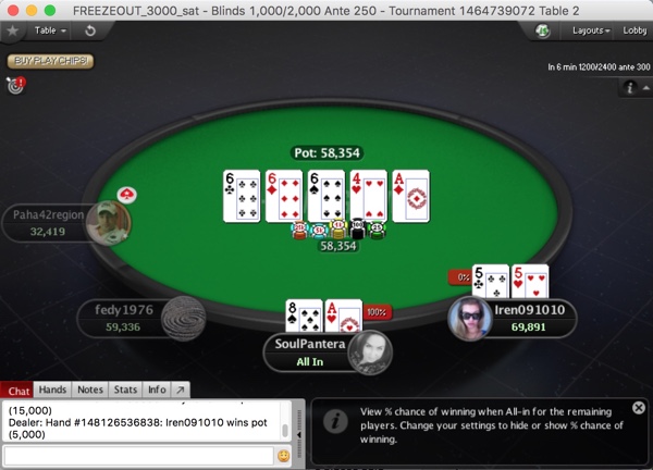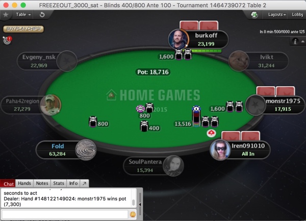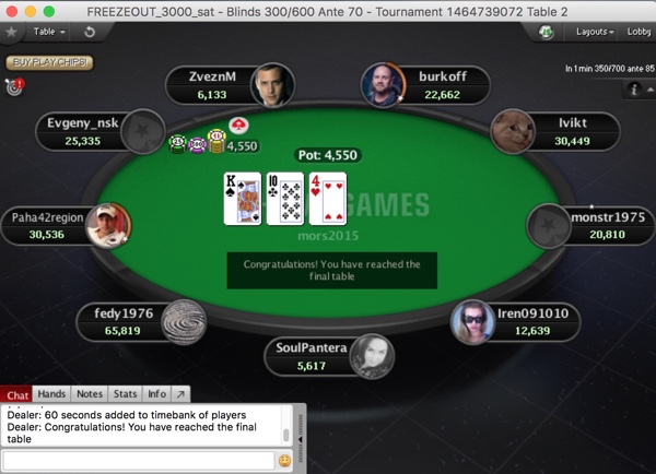 После таких откровений чат надолго замолк. Может, дело в том, что один за другим вылетели Вальд ( < Плигина - две дамы к терну!) и Борисов ( < Сантагиной и < Ольвинского - сет на флопе), а Рыжих удивилась о последнего ( > со стритом на терне). Положение по фишкам в топ-5 за исключением воспарения Иры, мало отличалось от того, что было на старте. Ну а Плигин перешел рубеж в 100 тысяч.