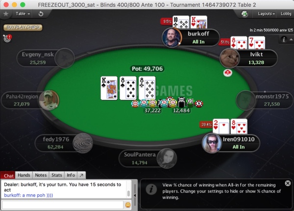 Тут случилась простенькая раздача но... с далеко идущими последствиями, которая подчеркнула игривое состояние стола. Бурков дал мини-рэйз из середины, Вальд поддержал с катоффа, а Сантагина моментально двинула олл-ин с баттона. Блайнды и оба рэйзера - быстрый пас. Игроки застучали по клавишам в чате.