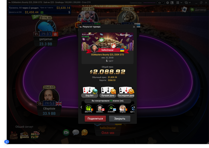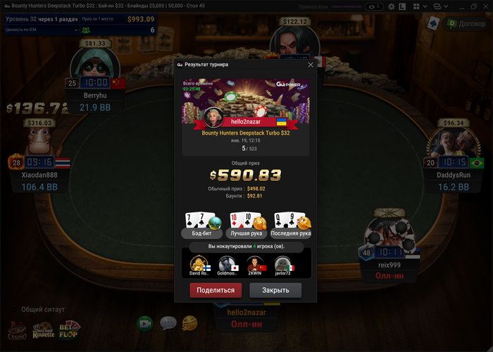 Вчера игра не складывалась до последнего турнира, который сложился - и снова 5-е место. На финалку вышел чиплидером, но в первой раздаче против короткого не выиграл: AJs против QQ. Сразу же за этим раздали AJ (батон) против AA (бб) на флопе AJ10, тёрн J и ривер какой-то бланк, но уже отскочить вариантов не было.