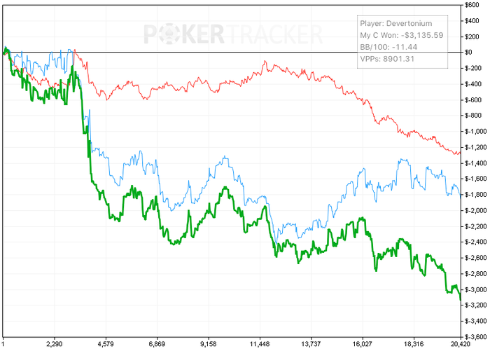 Что-то ситуация с красной начала серьёзно напрягать, так что вторую сессию играл на грани закипания мозга и один чёрт получил в районе -16бб/100 по ней. Потом отфильтровал ЗУМ, там в плюсе. Отфильтровал ЗУМ на дистанции - там отрезки от +5 до -7бб/100. Успокоился, думаю в таких составах регулярных столов (2 мегарыба чаще всего) в плюсе она у меня не будет, даже когда каждая доска перестанет превращаться в катастрофу с каждой новой картой.