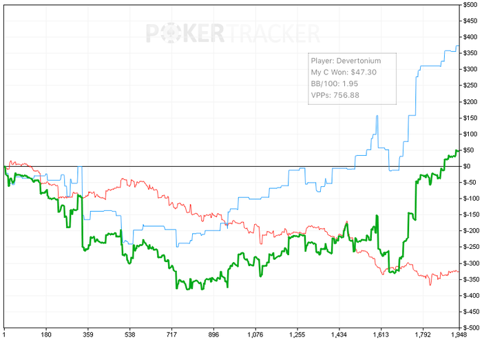 Наобезьянил тут в плюс против пары фишей, забавное чувство, когда график идёт выше нулевой отметки, я уже и забыл как это выглядит, правда счастье продлилось недолго. Короче, хватит, начинаю процесс бросания писанины по покеру, сам себя достал этим нытьём, да, всё хуёво, но не уверен что эти тильто-простыни мне как-то помогают, а вам уж они тем более нахер не сдались.