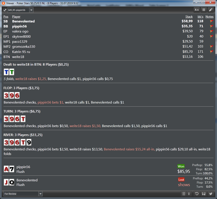 Rustin, OGamee, Morrowind, 99 на фр точно не всегда трибетят, тем более там фиш на бб. Bene в банке с фишом по идее не должен блефовать, а если вельюбетит так, то с чем? 33 вряд ли, 66 и 109. По игре показалось что могу сделать хороший фолд и главное я увижу что он хороший! Вот реально, если бы не было гарантировано шд, то вколил бы, а так думаю вот порадуюсь такому крутому хирофолду и выложу на форум. Выкладываю: