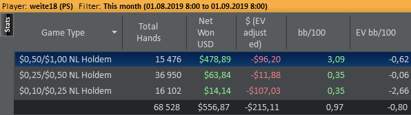 Итоги сентября: По рукам получилось больше чем ожидал, правда после первой катки 5-го сентября был всего один день выходного за весь оставшийся месяц. Но устаю сейчас не так как раньше, поэтому это ожидаемая подстройка скорее - больше часов надо уделять для сохранения профита. Восьмерки идут так себе, как видно. Пока утешаю себе тем, что не подстроился под поле, всё таки сразу и новый рум, и 6 макс, и зум тенденции. По ощущениям фишей в снепе хватает на этих лимитах. Благодаря бонусам на первый деп даже в микроплюсе. На переап можно не смотреть, ХМ до сих пор считает ноль ЕВ при выставлениях когда опп берёт кешаут. Кстати и профит у меня не сходится, по кассе плюсанул 1600 примерно.