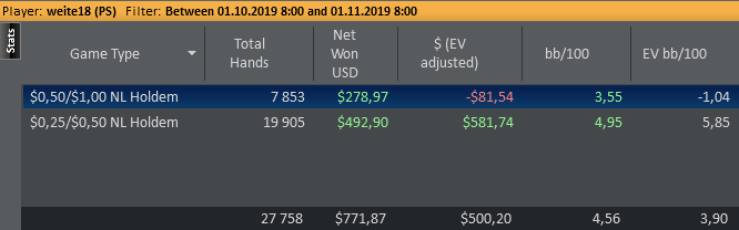 Надо хотя бы отчёты по месяцам не забрасывать. Октябрь Ноябрь В октябре было мерзкое ощущение по игре, в ноябре не улучшилось. Сотка никак не пойдёт нормально. В самое сладкое время в году хотел начать потыкивать 200, но придётся повременить. Не понимаю что не так с нл100, деньги вроде там точно не давят в отличии от нл200, играю достаточно давно чтобы привыкнуть. Да, на нл50 пришло много регов нл25 после 4-х столов, которые не такие опасные, но и на нл100 много регов с нл50. Вывел всё из восьмёрок, к хренам собачьим, жалко столько времени и сил. Как вариант подрубать рег столы в доп к старзам, но не сейчас. Поляна в снепе на 50 отвратительная и я её явно не вывожу. Очень не привычно без стат и 6макс, но еще время тратить на него не хочу. Общий результат. С учётом бонусов и первого депа вышло в минус 150 В декабре есть настрой и желание много отыграть, без положительных результатов правда тяжело к этому идти, так что надеюсь что будет и складываться хорошо. Нужно не забирать кальян и минимизировать алкоголь.