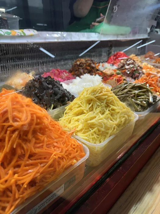 Внутри здания всё по-прежнему, как и 30 лет назад, отдел с азиатскими вкусняхами. Знаете морковку по-корейски? У нас её называли Морковча́. Так вот, есть такая же картошка и это моё ван лав :) В предыдущие приезды бабуля сама к моему приезду делала целый тазик такой картохи. По-моему, больше её не встречала нигде вне Хакасии, возможно, в Краснодаре находила с трудом. Третий в том же ряду - папоротник :) Но его слишком давно не ела и сегодня брать не рискнула так спонтанно. Слишком давнее и интимное воспоминание, чтобы вот просто так купить в первой попавшейся витрине 😁