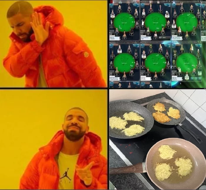 И тут наблюдательный покерист заметит: а может какие-то сковородки не стоило использовать, это ж доп электричество, это доп потом мыть посуду. На дистанции минус. А я отвечу - я соотнесла риски (затраты/профит) и поняла, что огромную кастрюлю натёртой картошки я быстрее пожарю на трёх сковородах и их помою (посудомойка, привет!), чем буду стоять долго над одной. У меня есть покерный бэкграунд) и я знаю, что такое дистанция