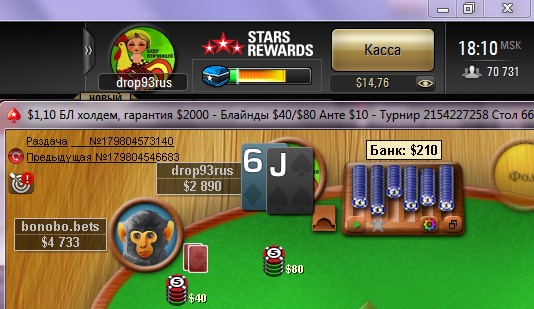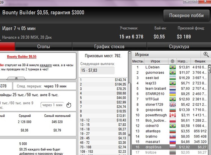 Скатился до 3 баксов. Ну всё, думаю - трипипец, как говорит моя возлюбленная. регМТСНГ по 0.25 я не могу играть, просто тошнит от них. Лучше сыграю шесть турбо по 0.5 и вылечу нахрен. Мысленно распрощавшись с ПС, воодушевившись постом ВосхоДа, сыглав два гипертурбо снг-саттелита за 10 старзкоинов каждый на билдер по 0.55. Выиграл оба. Всего за вечер сыграл два турнира - винтер серию за 1.10 (разметали на ранней в пух и прах) и билдер. Теперь на счету аж 21 бакс. Марафончик продолжается...