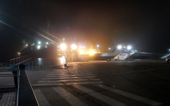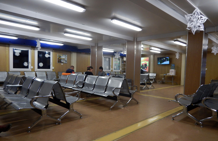 Остаемся зимовать Приехали в 18:00 и уже 1.5 часа как переправа была закрыта. Туман уплотнился. Нам в зал ожидания принесли кулер, чай и сахар. Народ уже укладывается спать на сиденьях. У нас пока ещё полупусто Стол у нас под кулер забрали. Поиграть не успели. Придётся в покер играть