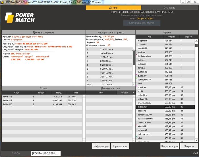 недолго мне пришлось крутиться на заводе в снгшках новый топ кеш посоны, слегка не доехал против лютых фишей вчера планировал играть дешёвые мтт на старзах, но сел в итоге снг на винмакс и открыл 1 тур за 5 евро Коктейль называется, в нём мимо, а в снг + €26 в субботу обычно делаю выходной и вечером хожу играть в баскет, но сегодня решил пропустить Как и вчера загрузил снг сессию и подгрузил ещё пару туров. коктейль за 5 и ещё один нокаут за 5, его мимо. Ну а в коктейле вот доехал. Второй 4-х знак в карьере турнир прошёл в принципе ровно и гладко без сильных перепадов. Из интересного выделю пару моментов. Когда попал в призы стек стал усыхать и надо было умножаться. Оставалось чуть меньше 10бб, пришли А8s схлёст против двоих, у одного мелкая пара, у второго Туз с картинкой. флоп пустой и мне нужна была 8-ка которая вышла тёрном, х3 играем дальше.. )) какое-то время держался со средним стеком, потом начал увеличивать стек и за столом появился фиш со стеком 50бб+ который периодически пихал олл ин. думаю "ну попадись мне", позже приходят АА и дааа фиш пихает 50бб+ у меня где-то 45бб, я кол там А7 и х2. дальше особо ничего интересного, в какой-то момент был 1-й стек. предфиналка порадовала. все фиши 4 играли телефона, один с планшета