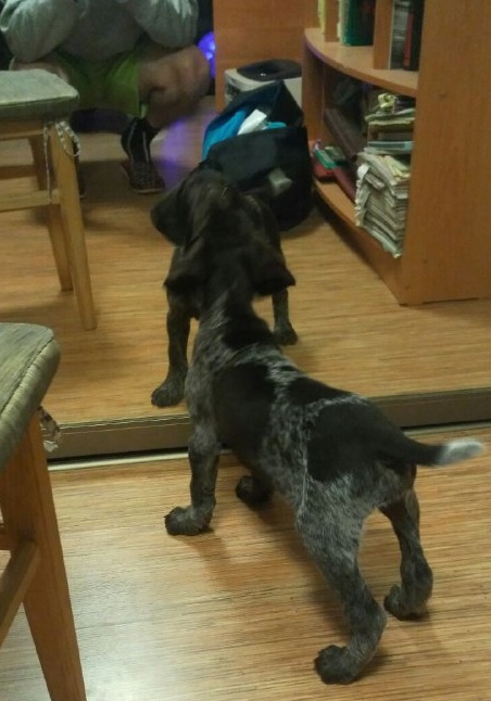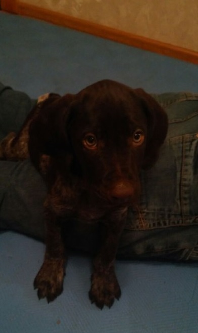 SmellsLikeFish, купили. драатхар, зовут Брэм. Так его назвали предыдущие хозяева из-за его немецких корней. Откликается, "ко мне", "сидеть" выполняет. Смышленый для 2х месяцев, будет охотником. Залез на руки и вырубился. Катушка откладывается)