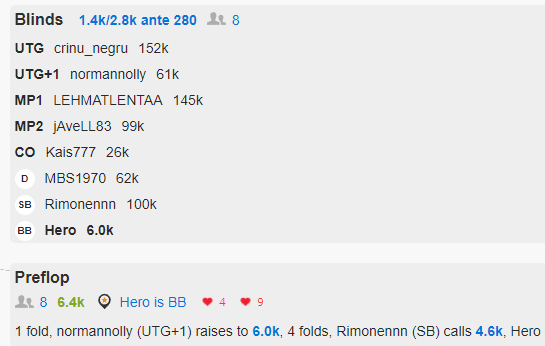 Давайте так сделаем: Кто за колл плюс, кто за фолд минус Есть несколько стеков по 4-5бб за другими столами, фишек хватает на 5 раздач