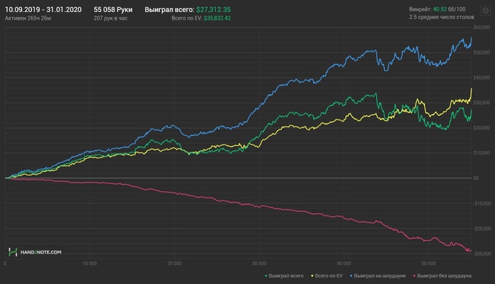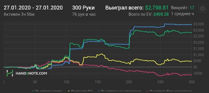 Но потом случился переход на 200. И это стало поворотным моментом. Там мне уже регулярно давали хорошенько просраться, там я снова плотно засел за теорию, нонстоп подглядывал у наиболее сильных регов их мувы и фишки, пытался их понять и разобрать по косточкам, а потом и модифицировать по возможности. И там, наконец, начало появляться ощущение, что я заслуживаю того, что имею. Что я не просто обнуляю фишей, которые особо и не сопротивляются, а что мне приходится бороться за каждый блайнд, не теряя фокуса, постоянно ища возможности откусить хотя бы каплю от стека грозного рега, с которым даже просто в одном банке страшно находиться.