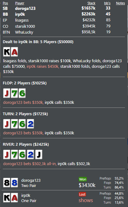 Уже ИТМ в Биге за 3,30 Чуйка говорила что там КК, но в диапазоне есть и АА и АК сложно сказать думаю сЫграл отвратно, хотя мог не заманивать в ловушку и пихнуть префлоп и один хрен вылететь