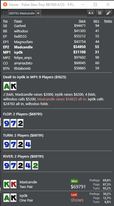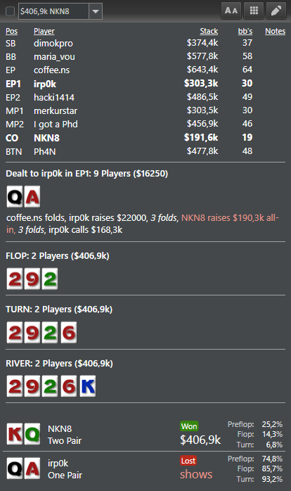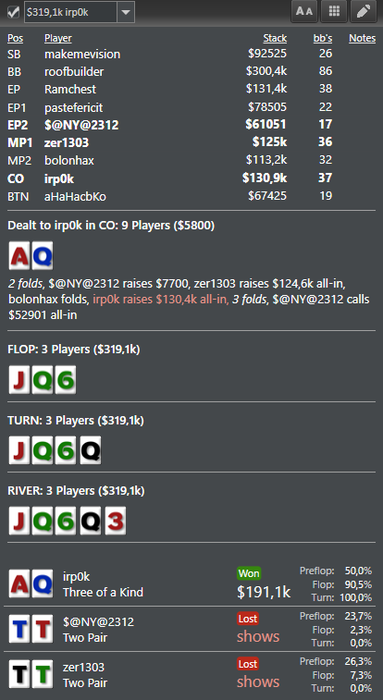 Почти всё воскресенье писал большой пост прям в теме а не в черновике, оставил на понедельник отредактировать и вечером вместо ждущего режима выключил ноут и потерял всю писанину.... Это можно прокомментировать так: Покер уже играю по вечерам, думаю начать "последний марафон" но без громких заявлений просто начал и ебошишь себе по тихому. Ппц сложно играть сессию по вечерам, вспомнил всю боль прошлую. Начал запускать дешевые СнГшки и подрубил 2 турнира копеечных по 0,55. В биге 0,55 даже на финалку вышел и начал стримить, было 3 зрителя)) Уже под утро сильно ломало и практически не помогало в перерыве проветривание. В 5 максе сыграл уебанскую раздачу, уже голова затуманена была и меня начинало вырубать. Не рекомендую регать турниры уставшим, сонным, пьяным, взволнованым. Лёгкий фолд на флопе против пасивного фиша, но что сделано то сделано, можете меня хуесосить.