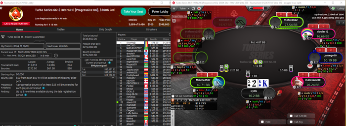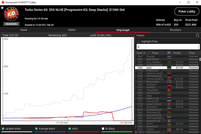 БР $250 Спустил 50% с пика. Ничего страшного просто не складывается в важных раздачах + немного превысил лимит сателитов(ну как превысил, раньше их попросту не играл), 5 раз отобрался на турбосерию мегасатами 2х$55, 2х$109, $11Day2. Сделал только 2 баунти в 55ке остальные без ИТМ, не надо паниковать 5 турниров это ваще ниочём. Из-за малого количества игры утром думаю подключить 1-2 рума по несколько турниров, смотрю что интересного есть. Слепил в группу игроков, кому интересно можете сталкерить.