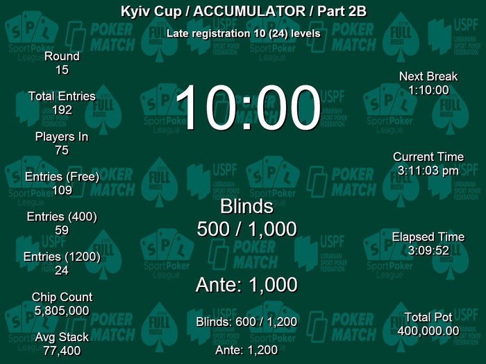 Kyiv Cup/Accumulator/ Part2B Идёт 18-й уровень. Блайнды 800/1600, анте 1600. Свою турнирную жизнь на данный момент удалось сохранить 83 спортсменам из 222 участников, севших сегодня за покерные столы. Поздняя регистрация доступна ещё 7 уровней по 20 минут.