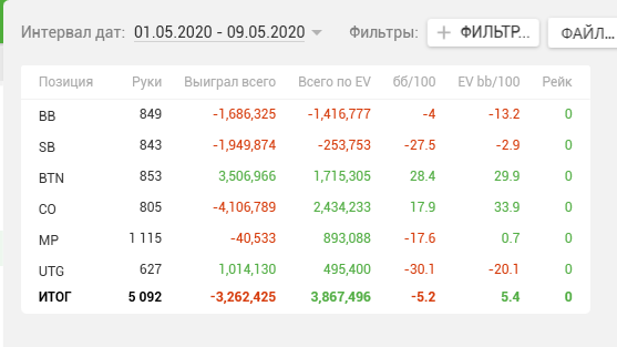 Из-за погодных условий не удалась поездка в деревню, играл субботу, всю в минус, воскресная катка также не удалась, время подводить итоги месяца Pokerstars.es - 1375 / начало месяца 500 Winamax - 1747 / начало месяца 1000 GG.network - 955 / начало месяца 70 Румы по отдельности: Вот шарк за май: