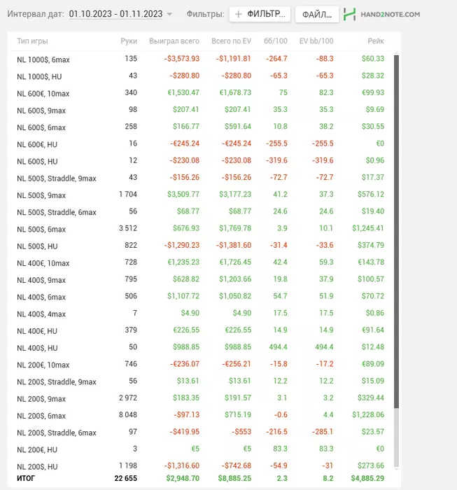 Больше всего моя ужасная игра отразилась на ХА на нл200, там было совершенно море ошибок, а на 400-500 мой мозг соображал неплохо даже с ощущением зажженной пороховой бочки внутри. Пришлось дополнительно выделить время теории игры в ХА. В конечном итоге, не смотря на разницу в 6к$ по ев, я смог плюсануть в октябре 2150$ без учёта рейкбека, что для меня было прекрасным окончанием тяжелого месяца.