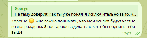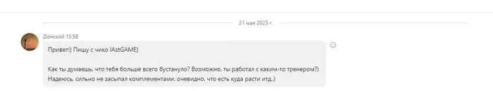За треню я старался дать как можно больше информации, поэтому созвон продлился 2ч43мин. К сожалению, все похвалы в мой адрес идут в виде аудио, либо в самой трене, но их было и правда много (Гоша очень эмоциональный человек и щедр на слова). В переписке было лишь следующее: