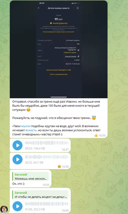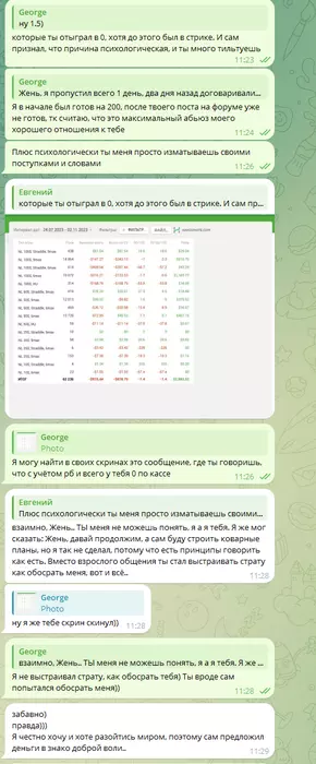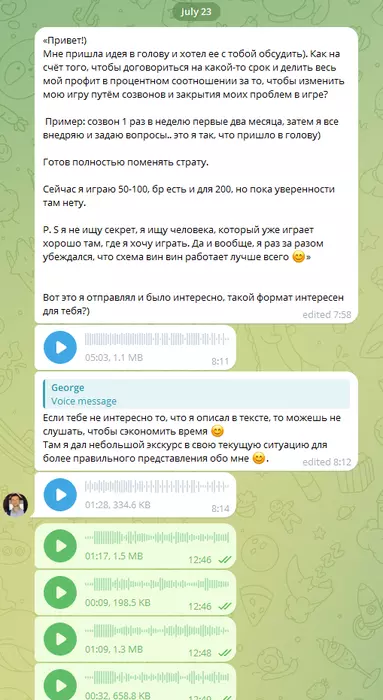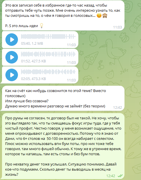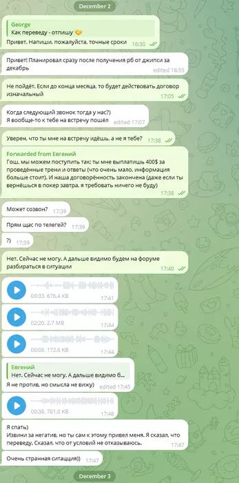 Тут у меня уже сгорело. Мало того, что человек обесценил мои труды, так затем ещё представляет это всё так, что он идёт мне на встречу, а в аудио говорит, что если я не соглашусь ждать 200, то должен буду его тренировать, но он будет стараться делать так, чтобы не выигрывать больше 600$ и не будет мне платить ни копейки.