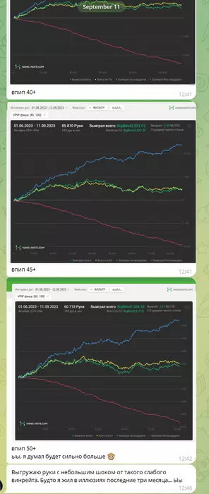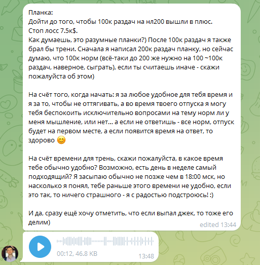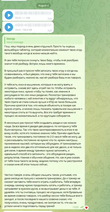 Предложение я выдвинул очень комфортное, и в аудио он сказал, что я гений, что придумал такой способ помочь ему. Поэтому наши тренировки продолжились, и я продолжил очень много отвечать ему в телеграмме по раздачам и мыслям. Хоть и дни, когда его штормило в эмоциональном плане, порывался бросить покер (на пару дней даже уходил), продолжались.