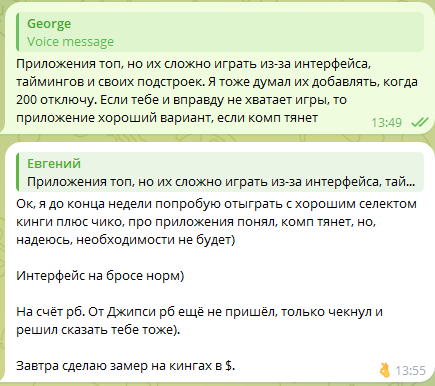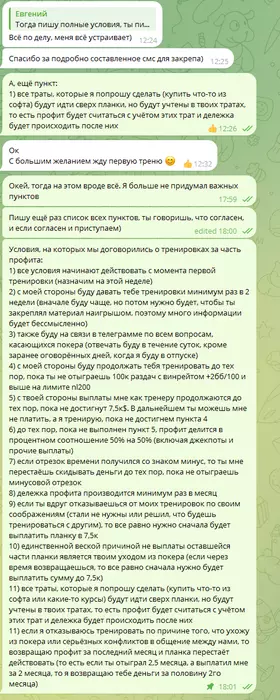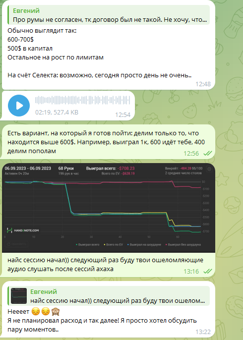 И вот, в какой-то момент он мне говорит, что он переборщил с условиями, которые сам же предложил, и что это не справедливо, что он должен столько платить (хотя не было уплачено и доллара после самой первой тренировки), аргументируя это всё тем, что у него сложная фин ситуация (как я выяснил потом, у человека 8к+крипта на несколько тысяч в БРе, что более чем достаточно для лимита нл50-100). Затем сказал, что хочет подключить игру в Приложениях, доход с которых не будет считаться в договоре. Я, конечно, офигел, как быстро меняются условия, но нашёл приемлемый для него выход, тк чисто по человечески понимал, что когда деньги давят, это тяжело: