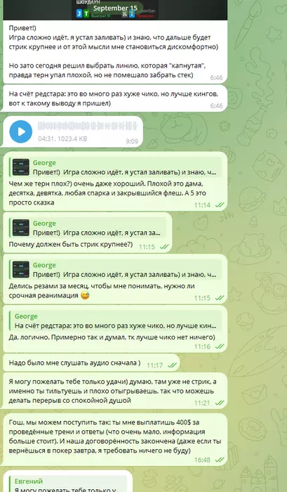 И вот, наступает 15 сентября. День, когда я вдруг узнаю, что Гошу всё задолбало, и что он хочет покинуть покер, и уж точно не вернётся до января. На что я предлагаю выплатить 400$ за потраченные мной усилия, и мы полностью закрываем договоренность, даже по возвращению в покер (уже тогда было ясно, что он в него вернется):