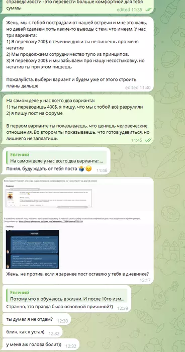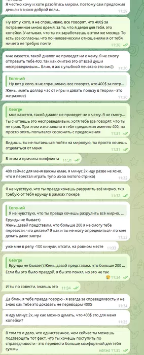 Обсуждая всю эту историю с Даней hpntz_, я получил не мало фидбека и был уверен в своей правоте. Даня выступал на стороне света и сказал мне, чтобы я успокоился и не выставлял всё на показ. Мол, в 23 все имеют право на ошибку. Поэтому пришёл к выводу, что раз Гоша всё осознал, то пусть переведёт мне 400$, и мы закроем этот спор. Мне важно было, чтобы он показал, что и правда понимает, что не прав. Но после темы в арбитраже наша переписка продолжилась: