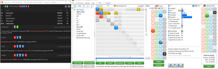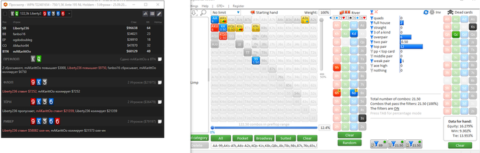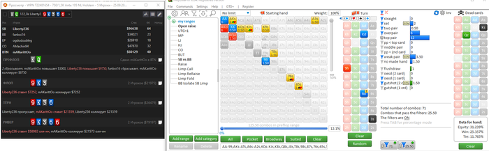 Эквити конкретной руки против диапазона,слабовато стоим низ диапазона получается...