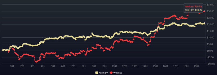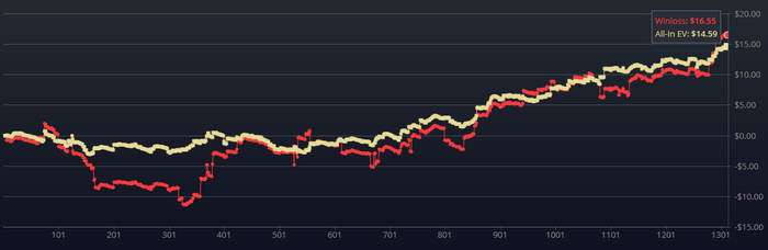 Andreyvorob3, в смысле? Я в комменте выше об этом и прописал. И как это есть на практике в трекерах. О комиссии за страховку я знаю, просто к обычному рейку ее не приплетал, думал ты о каком-то еще двойном стандартном рейке говоришь за раздачу, где взял кэшаут. Посмотри в трекере раздачу со страховкой, там EV и факт отличается как раз на сумму комиссии за взятый кэшаут. Хочешь сказать, х2н этот 1% не только в разнице в графиках отображает, но еще и в рейк? Тогда это существенный багич трекера будет, если одна сумма отображается как в EV графиках, так в рейке.
