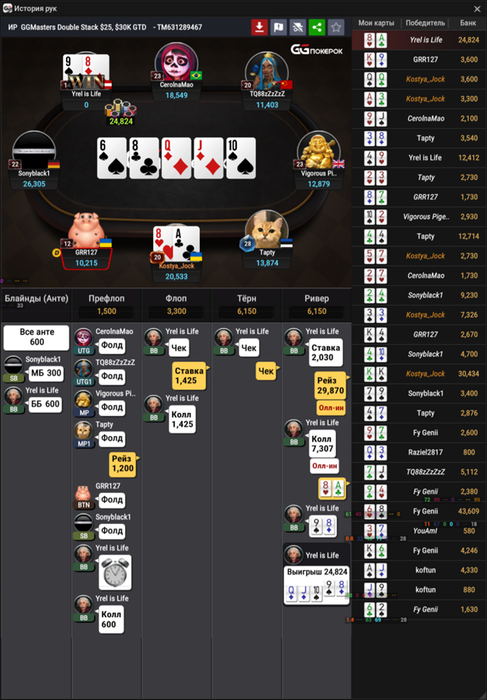 опп рег, по терну ставлю не много, что б добрать с дро + с 9х,10х хуже и по риверу уже чек чек если не получим допер, на рейз кол так как есть блефы типа Дх,Кх фд и тд, по риверу ловим трипс + блочим стриты через 8х и я посчитал что здесь лучшая карта для блефкетча, но возможно из-за того что поле не так много блефует, здесь не нужно колирувать?