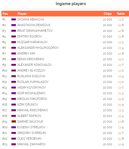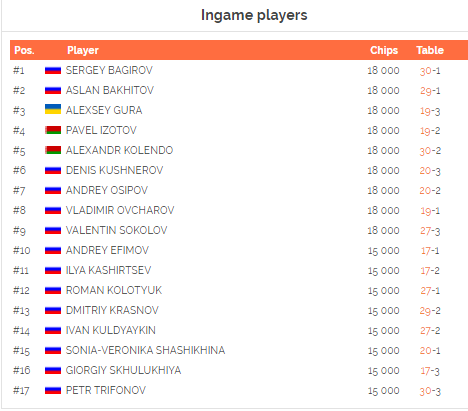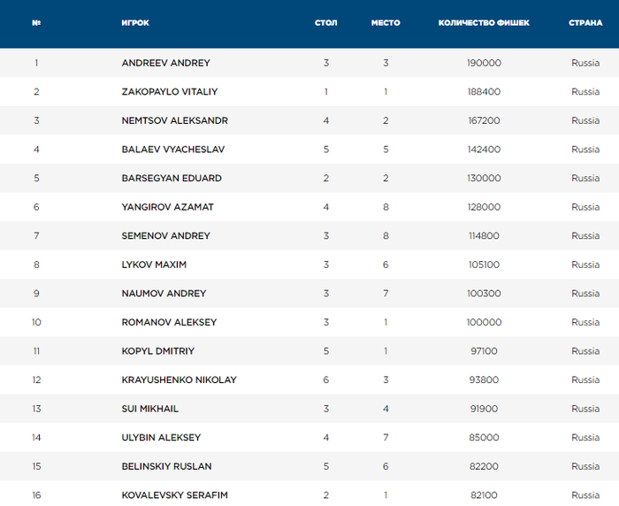 Что интересно, на 14-м уровне 1,000/2,000 (закончили на 19-м) у Стрелкова оставалось всего лишь 100 фишек. И с этой крохи ему удалось раскрутиться и выиграть билет.
