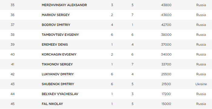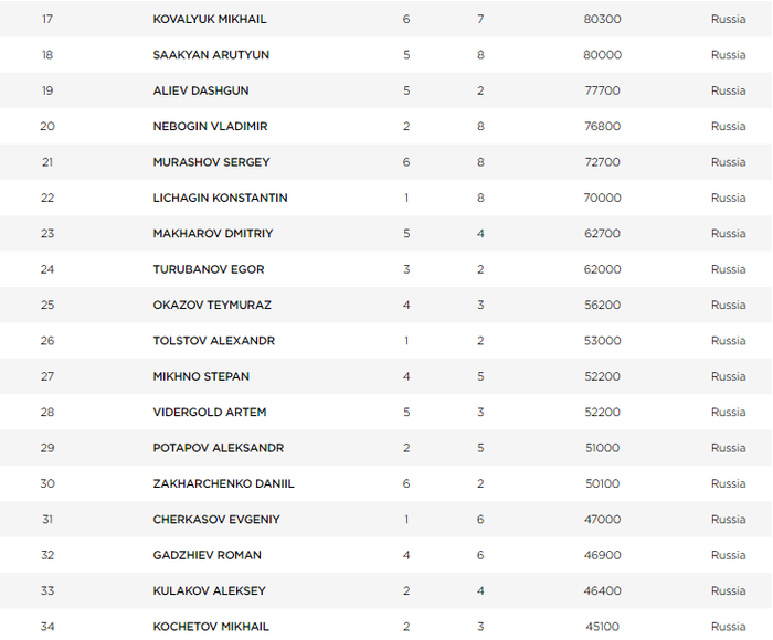 Александр Немцов - 145,000. Вячеслав Балаев - 136,000. Максим Лыков - 127,000. Алексей Романов - 112,000. Андрей Семенов - 111,000. Руслан Белинский - 105,500. Андрей Андреев - 103,000. Теймураз Оказов - 98,000. Михаил Суй - 94,000. Виталий Закопайло - 90,500. Дмитрий Копыл - 90,000. Михаил Ковалюк - 90,000. Константин Личагин - 84,000. Александр Толстов - 81,000. Азамат Янгиров - 75,000. Дмитрий Махаров - 73,000.