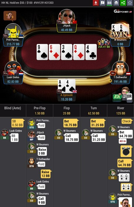 Но на самом деле это не настолько плохо как можно подумать, в солвере где-то в -2bb (понятно что очень много). В раздаче мысли были о том, что из понятного вэлью там сеты и Qx - это мало комб, учитывая 3/4 на флопе Qx остается совсем мало. Блефы понятные есть, а быстрым таймингом поставить TT-JJ или тем более 9x, довольно сложно и не уверен что это вэльюбеты.