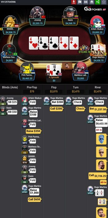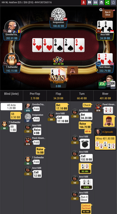 Вот такая раздача например, по смайликам можно понять, что я думал. Знаете это чувство, что как будто подстроено, коллишь когда «должен» и уже знаешь что увидишь. Тут конечно можно выкинуть, если до шд спросить меня какая там рука, то очевидно тузы, пусть эти 10% пота ебучих и чек, чек-пуш с какой-то другой рукой сыграет хоть один раз. Еще на самом деле TT тут блафкэтчер, и лучше коллить с Ax, блочащим AA, но я выдал кредит доверия в сильную игру и наличие блефов у оппонента (телефон и не смог красивую сфолдить на самом деле).