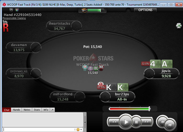 -совершил "почти невозможное" - затащил 2 раза кряду топ-1 в гипертурбо 12мах с "профитом" $109 в виде билета, не вложив при этом ничего (халявный долларовый билет из сундука). Но и тут допустил ошибку посчитав, что бОльшая вероятность забрать $200 при попадании в ИТМ (7 место из 20 человек в турбодип сателлите к WCOOP за $109) лучше возможности сыграть хоть раз в жизни турнир за $1К..