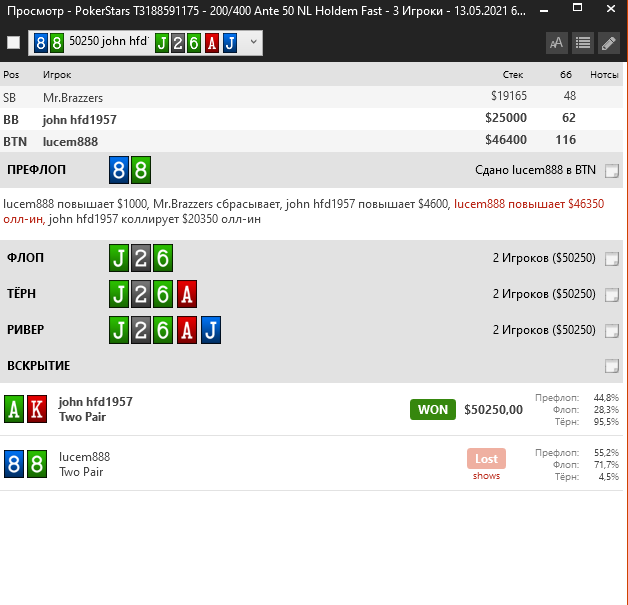 А во второй раздаче пушила префлоп. А в целом хорошо сыграно, просто не повезло. Этим фишам везёт бесконечно.