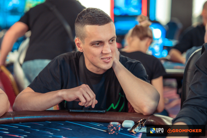 Играет с билета, выигранного на Grompoker в онлайн-сателлитах. Говорит, что пока особо фатального ничего не происходило, просто подворовывает шашки у оппонентов.