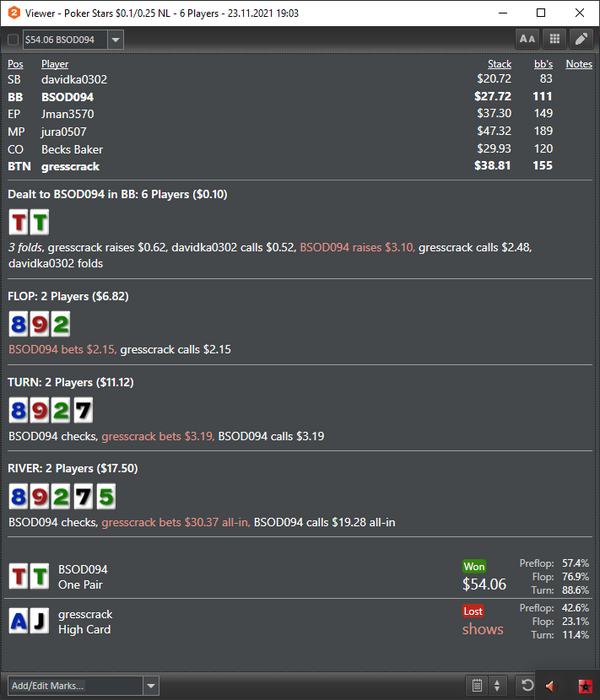 В середине месяца у меня был провал в 300$, т.е. в 1.5 раза больше, но его я пережил спокойно, видимо из-за того, что мозг понимал, что до конца месяца ещё далеко, есть время изменить результат и это только половина "пути". В этом моя проблема, я измеряю покер отрезками. Сессия, выходные, неделя, месяц. И если что-то идёт не по плану к концу "отрезка", то мозг начинает тильтовать. Иногда тильтую начав сессию в +5БИ, а закончив в -1БИ, хотя, казалось бы, рядовая ситуация. Второй пример является причиной этого поста - за месяц сделал 40БИ и у меня "отнимают" 8БИ за одну сессию.