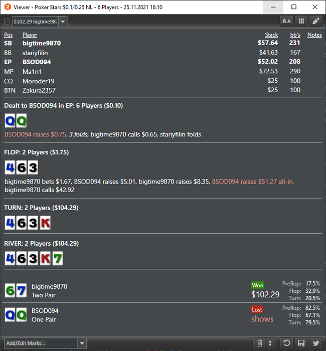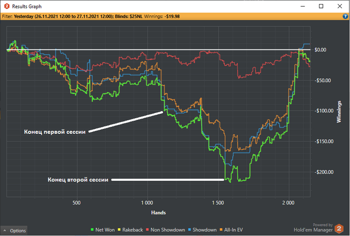 Было три сессии. Первая была довольно тильтовой, ничего не получалось. Все блефы в молоко, все готовые руки имеют 80-90% эквити на тёрне и превращаются в пыль. Удары по столу мышкой звучат чаще с каждой минутой. Моя вина тоже есть, отдал лишних денег в тильте фишам.
