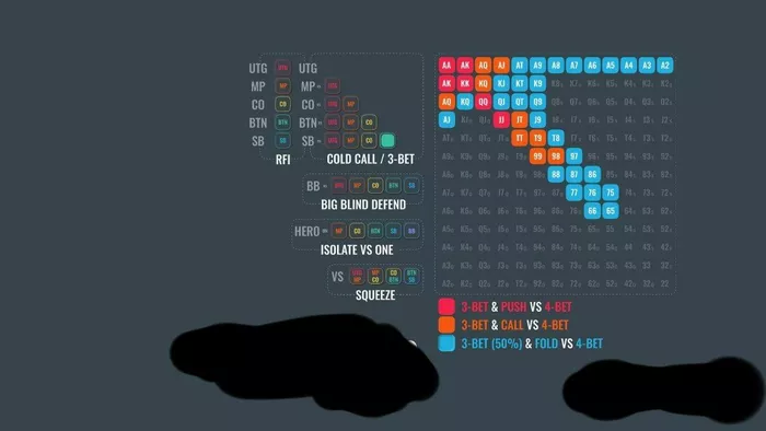 Здравствуйте! Я новичок. У меня есть такой вопрос. На прикрепленной картинке чарт защиты малого блайнда от оупен-рейза с баттона. Согласно ему, руки, помеченные красным, мы должны трибетить на оупен рейз и пушить в ответ на 4-бет. С руками, помеченными оранжевым, мы должны трибетить и коллить на 4 бет. С руками, помеченными синим, мы должны в половине (50%) случаев трибетить и быть готовыми сфолдить на 4-бет. А что мы должны делать с синими руками в оставшейся половине случаев? Мы должны с ними коллить на рейз с баттона или фолдить?