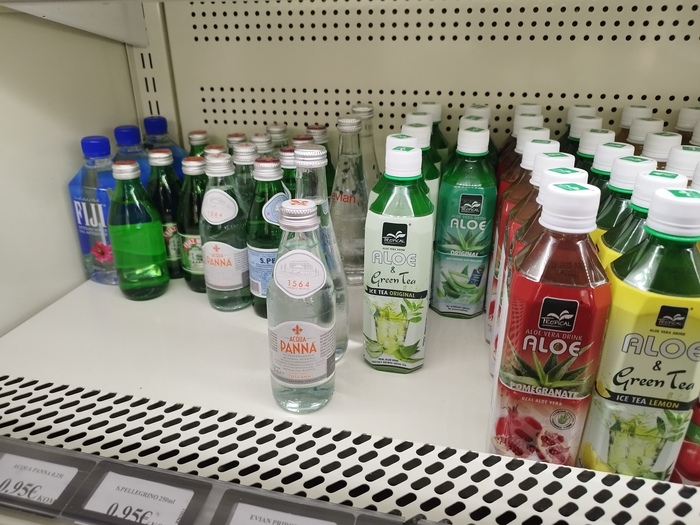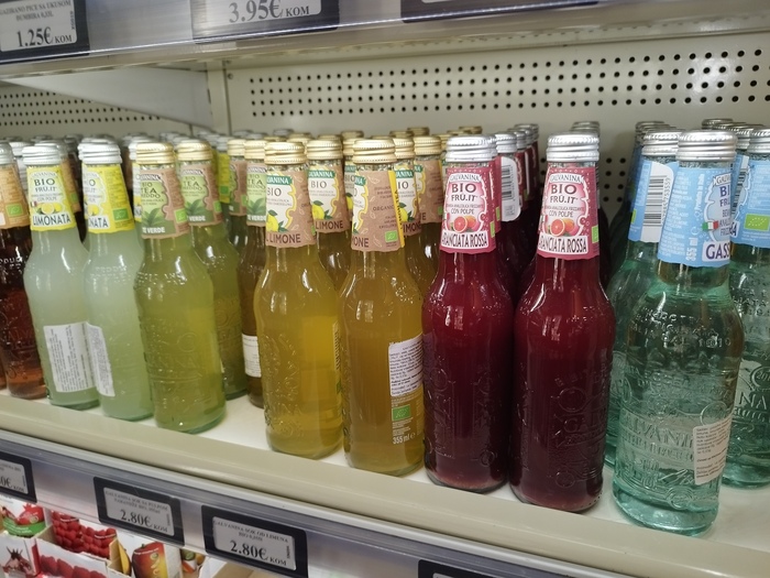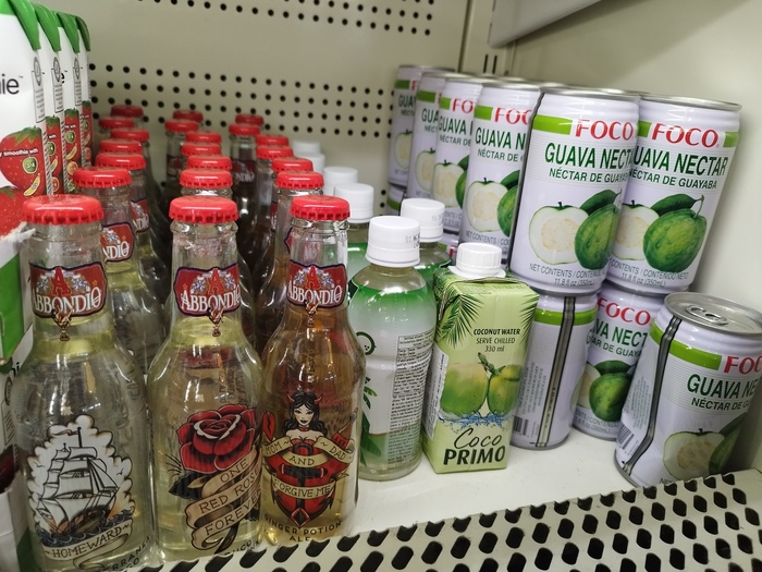 По безалкогольным напиткам Азбука нокаутирует когимара. Особенно то что касается минеральной воды, которой в когимаре уделен скромный уголок(на фотографии вся вода, которая есть), а в азбуке 2 ряда с 30-40 производителями от русских и грузинских до норвежских и французских. По лимонадам тоже, тут им посвящена одна полка с одним итальянским производителем. Тогда как в азбуке полно всяких оригинальных лимонадов, японского производства или английского с одуванчиками и т.д. Соков тоже буквально пару экзотических тайский в когимаре. Фрешей нет впринципе.