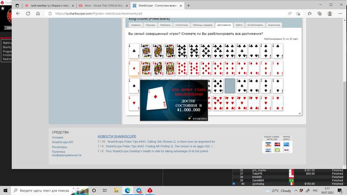 Наконец нагриндил на последнюю реальнополучаемую ачивку на шарке. Как же меня раздражает эта неполучаемая пиковая шестерка за снг по потлимитному холдему, которых блять впринципе нету. Олды, в каком году на старзах были такие снг?