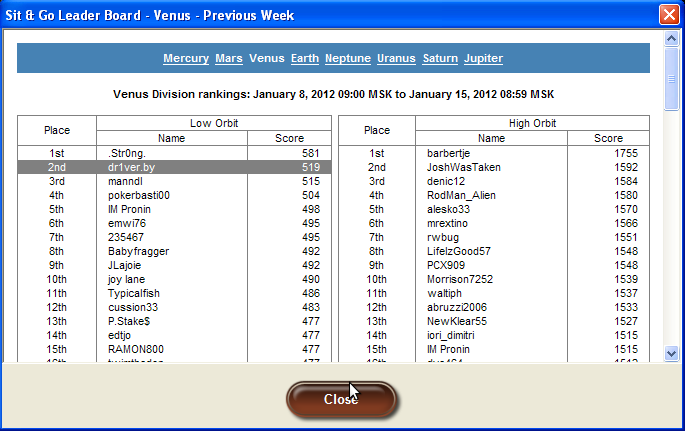Я сначала не понял почему я на позапрошлой неделе, когда побольше СНГшек откатал не занял ничего... Почитал про лидерборды - оказалось там два дивизиона - те кто сыграл меньше 100 турниров и те кто больше. На позарошлой я попал в старший, а на прошлой я сыграл всего 66 и получил 2-е место в младшем ) Эх, знал бы раньше - нашел время откатать еще пару десятков турниров и получить не лишние +200уе за 1-е место ;) Но теперь я прошаренный, и т.к. не играю СНГшки на постоянной основе, то буду сремиться к 2 сессиям в день - 99 турнирам в неделю, а там глядишь и бонус какой-нибудь получу ;)