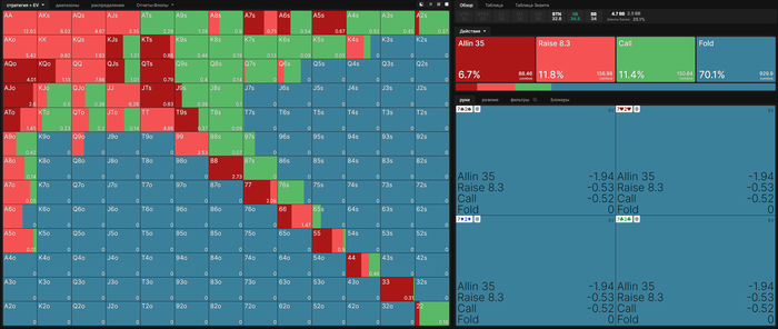 Так как я жмот (и немножко дурачок), то подписки на ГТО Визард у меня пока нет, но тем не менее, я активно пользуюсь их расчётами префлопа с чип-ЕВ. О сколько нам открытий чудных...