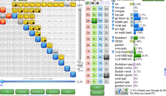 И блефы тоже можно добавить в треть в виде каких то 54с, 9хай, которым достаточно выбить Ах, Кх.