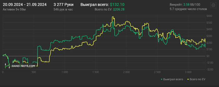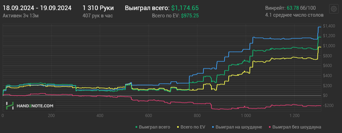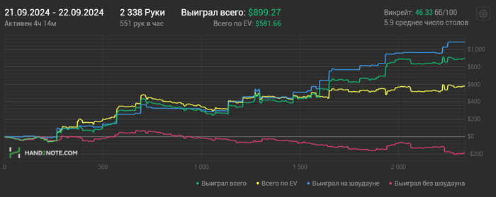 Когда профитнул 917 столы развалились. Было сыграно 2 часа +15-25 минут. Думал уже заканчивать, но решил еще посидеть. + час катки получилось наиграть, он принес плюс деньги) Но когда во второй раз все столы развалились, чему я поспособствовал сам за двумя столами, решил закрываться. Время уже было ближе к 3 ночи.