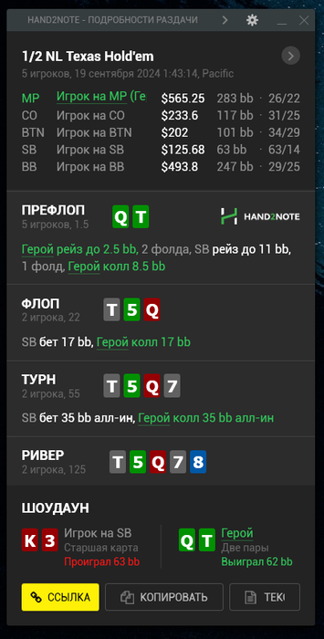 Потом собрал силы после небольшой зачилки, и добил теории 42 минуты. Потому что 3й день подряд не вырабатывать норму по теории не хотелось. Разобрал сегодняшнии руки (не все). Были недочеты по сайзам, были прям хорошие розыгрыши как с блефом так и вэлью. И один прям косяк с лишней агрой, ну это и стоило мне стека в ХА) Радует что я работаю, и не в пустоту это все идет. Постепенно качаюсь. Главное делать регулярно.